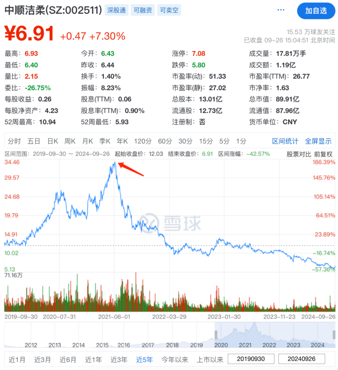 從A股中唯一生活用紙的龍頭企業(yè)到如今股價(jià)“跌跌不休”,中順潔柔帶著投資人一路坐過(guò)山車(chē)。在2021年5月底達(dá)到了巔峰34.46元/股,總市值創(chuàng)下了歷史高點(diǎn)的近450億元后,如今最新股價(jià)(截至9月26日收盤(pán))僅為6.91元/股,總市值也已縮水至89.91億元,三年多時(shí)間市值蒸發(fā)約360億元左右。