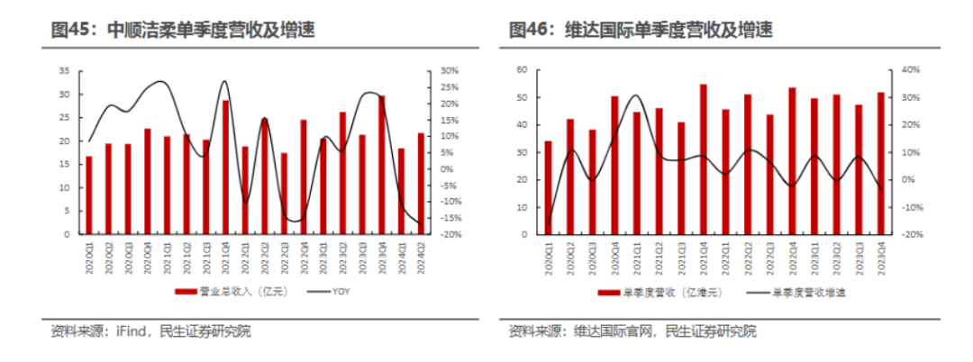 對(duì)比維達(dá)國(guó)際的單季度營(yíng)收數(shù)據(jù),中順潔柔的單季度營(yíng)收起伏明顯,這是生活用紙受到了促銷(xiāo)等淡旺季的影響,導(dǎo)致Q2、Q4兩季度偏高,單季度營(yíng)收增速上至25%,下至-15%;而維達(dá)國(guó)際的單季度營(yíng)收幅度則更為緩和,這是除開(kāi)生活用紙以外的業(yè)務(wù)矩陣進(jìn)行了良好的緩沖與彌補(bǔ),使得整體營(yíng)收也更為穩(wěn)定。