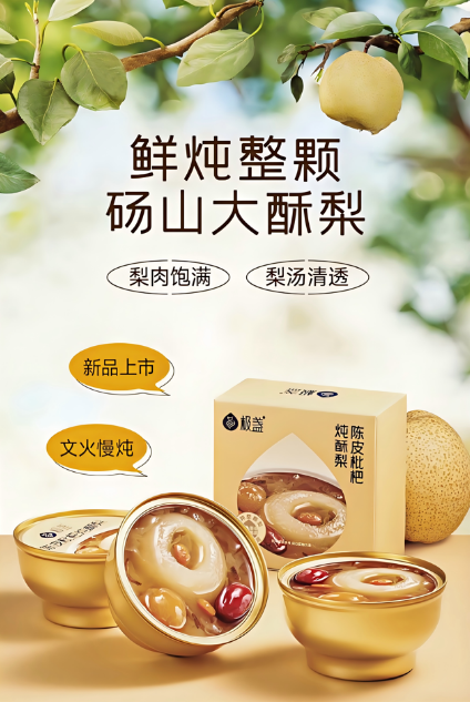 在應(yīng)季養(yǎng)生上,一些品牌開(kāi)始結(jié)合秋季熱門(mén)養(yǎng)生食材進(jìn)行產(chǎn)品創(chuàng)新,突出產(chǎn)品秋季對(duì)應(yīng)的養(yǎng)生功效。比如極盞推出“新會(huì)陳皮枇杷燉酥梨”,產(chǎn)品配料包括2017年新會(huì)老陳皮、碭山酥梨、塘棲枇杷、椴木銀耳、紅棗、枸杞等,并向消費(fèi)者強(qiáng)調(diào)“膠質(zhì)滿滿,清潤(rùn)可口,緩解秋冬燥熱上火”。