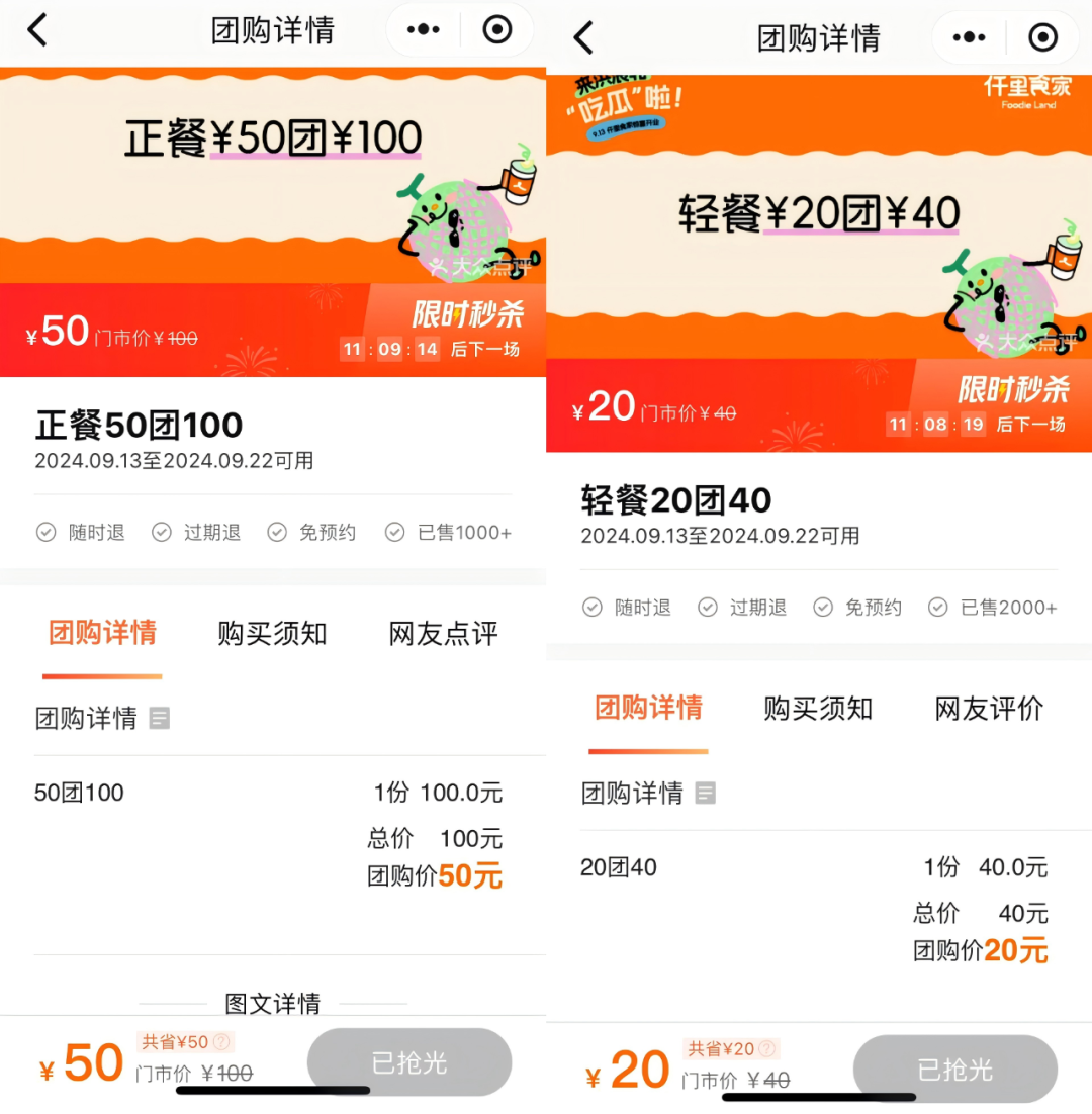 比如正餐50團(tuán)100,輕餐20團(tuán)40,而且在開(kāi)業(yè)當(dāng)天,這些券都已經(jīng)被提前搶光了。