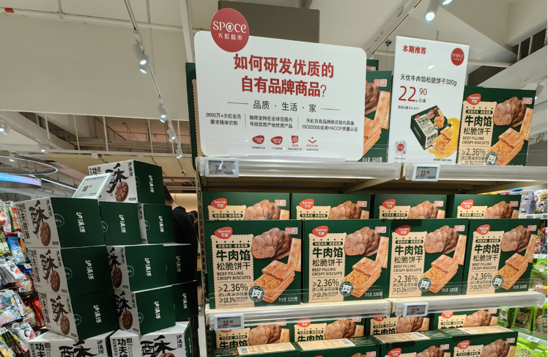 像自有品牌和品牌共創(chuàng),天虹積累了15年,今天已經(jīng)形成了天優(yōu)(食品)、菲爾芙(日用品)、天口味(生鮮熟)、奧百思(寵物食品用品)超級品牌矩陣,定位最優(yōu)產(chǎn)地和最優(yōu)品質(zhì),現(xiàn)全國供應(yīng)廠家達(dá)到130家,遍布八大省區(qū)、30多個城市,目前SKU數(shù)達(dá)到1000個,已覆蓋所有小類,年底計(jì)劃達(dá)到1400個,銷售占比20%以上(標(biāo)品),成為零售行業(yè)極其優(yōu)秀的存在。