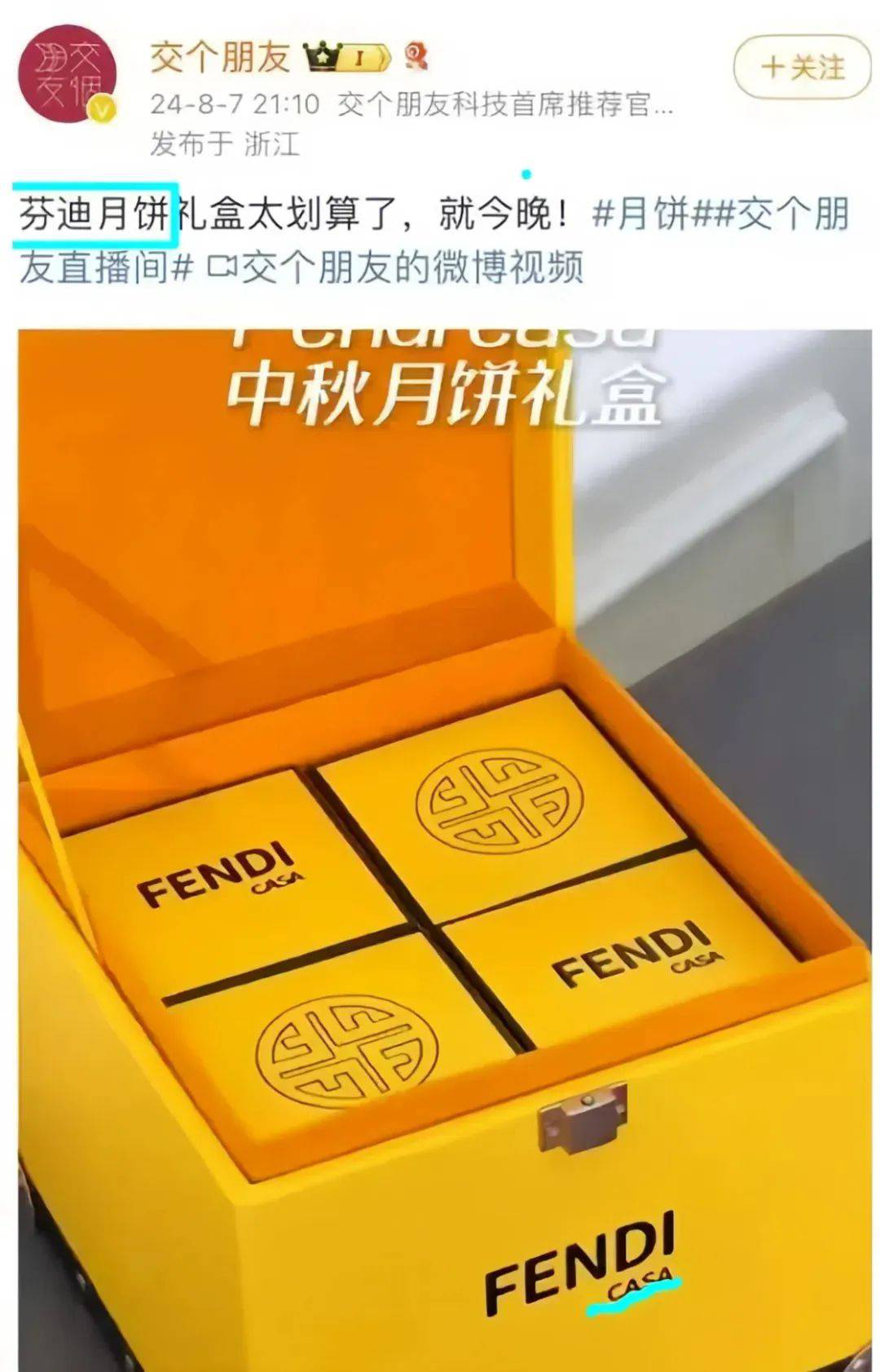 今年8月7日,“交個朋友”直播間開始售賣“芬迪卡薩FENDI CASA月餅伴手禮”禮盒售價388元,內(nèi)含8塊月餅及香薰蠟燭。并通過黃色的包裝配色和明顯的“FENDI”logo標識,暗示這款月餅禮盒和意大利同名奢侈品牌有關系。