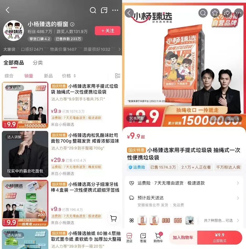 抖音上經(jīng)?吹叫罡缰辈デ衅瑥垜c楊和張開楊拿著大瓶礦泉水來測試垃圾袋的質量,那個垃圾袋就是小楊臻選的商品。由某城市某工廠生產(chǎn)出來,貼上“小楊臻選”的logo,以9塊9的價格賣出了1574萬件。