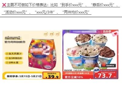 具體來講,商品主圖需避免以下價(jià)格誤導(dǎo)性表達(dá),如“到手價(jià)xxx元”“券后價(jià)xxx元”“活動價(jià)xxx元”“xxx元/3件”“兩件均價(jià)xxx元”等。同時(shí),平臺鼓勵(lì)并允許使用清晰、準(zhǔn)確且不易引起混淆的價(jià)格與促銷說明,如“贈品價(jià)值xx元”“前x名送”“可定制xx”“滿300減20”“第二件九折”“第二件減9.9元”等。