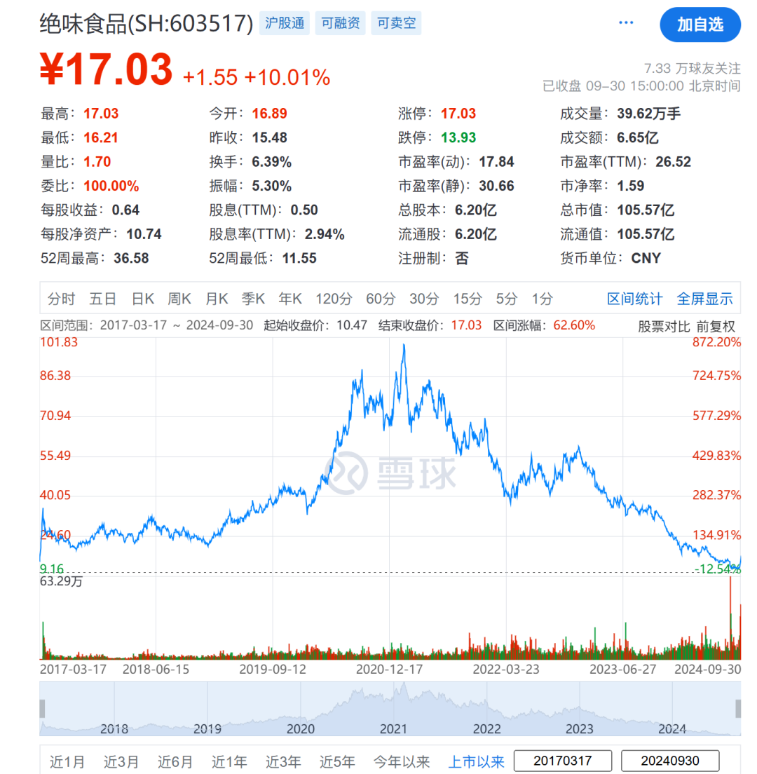資本市場(chǎng)方面,絕味食品昔日“資本寵兒”的地位早已不再,股價(jià)與市值大幅縮水。其市值曾超630億元,但截至9月30日,股價(jià)報(bào)收17.03元/股,市值跌落至105.57億元,蒸發(fā)近525億。僅今年內(nèi),絕味食品的股價(jià)跌幅就超50%。