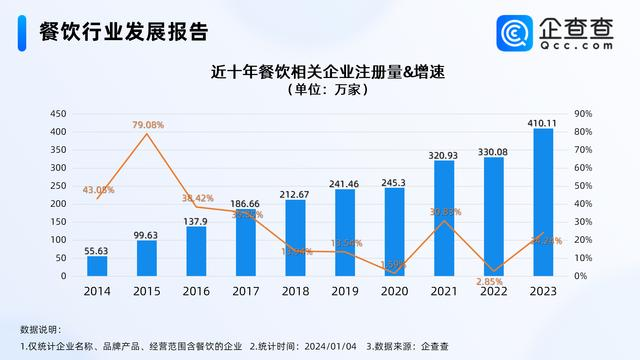 據(jù)企查查數(shù)據(jù),最近十年,我國餐飲相關(guān)企業(yè)注冊量呈持續(xù)正增長態(tài)勢,且年年新高。2021年、2022年、2023年我國餐飲相關(guān)企業(yè)注冊量分別超過320萬家、330萬家、410萬家。