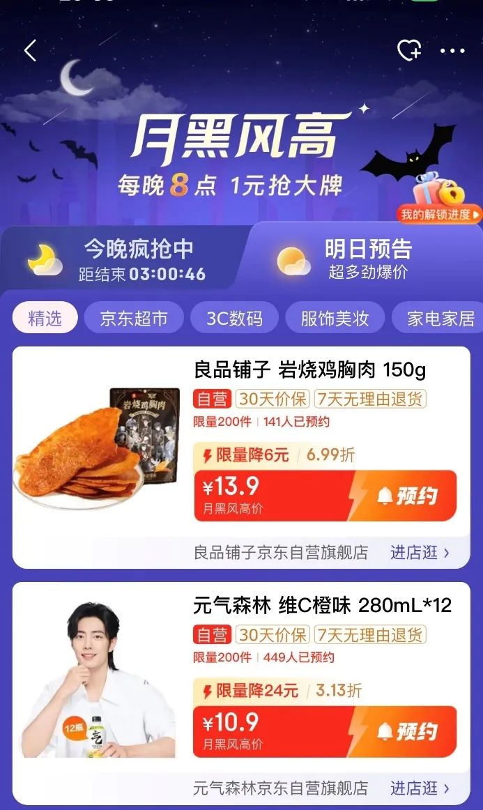 當(dāng)然,隨著互聯(lián)網(wǎng)、移動互聯(lián)網(wǎng)的高速發(fā)展,電商大促活動越來越多,京東的月黑風(fēng)高也一度消失在大眾視野。但自2023年京東加碼推動低價策略,“月黑風(fēng)高”這一經(jīng)典玩法便已再次回歸!不再是一年一次,而是每天都有。消費(fèi)者只要在京東APP搜索“月黑風(fēng)高”,或在京東APP首頁進(jìn)入秒殺頻道,找到頂部的月黑風(fēng)高入口,每天晚8點(diǎn)都能夠參與搶購。