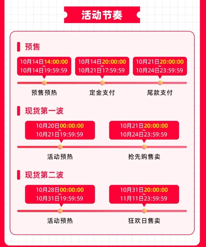 同時(shí),據(jù)淘寶雙11招商規(guī)則,淘寶的搶先購(gòu)是在10月20日0點(diǎn)開始預(yù)熱,10月21日0點(diǎn)正式開始;狂歡日是在10月28日0點(diǎn)開始預(yù)熱,10月31日0點(diǎn)正式開始,直到11月11日23:59:59。
