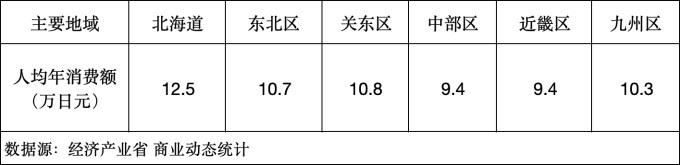 每個地區(qū)的消費(fèi)頻度、消費(fèi)偏好各有不同,日本的各個地區(qū)消費(fèi)者對于便利店利用的差異非常明顯。根據(jù)經(jīng)濟(jì)產(chǎn)業(yè)省《商業(yè)動態(tài)統(tǒng)計(jì)》,人均年度消費(fèi)最高的是北海道,達(dá)到12.5萬日元。當(dāng)然,消費(fèi)頻度與地區(qū)氣候、消費(fèi)口味、店鋪競爭程度有關(guān)系,歸根結(jié)底,源于消費(fèi)口味的商品特色、店鋪密度兩種價值取向的不同。