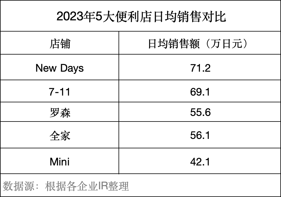 另一個案例是大家不太熟悉的JR東日本運(yùn)營的車站便利店“New Days”,顧客進(jìn)入車站想要買食物和飲料,幾乎沒有其它選擇,只能購買他家商品。在這個相對封閉的環(huán)境開展業(yè)務(wù),New Days的經(jīng)營效率非常高,2023年平均日銷售額達(dá)到71.2萬日元,超過行業(yè)頂級的7-11,更是遠(yuǎn)超羅森和全家、mini便利店。