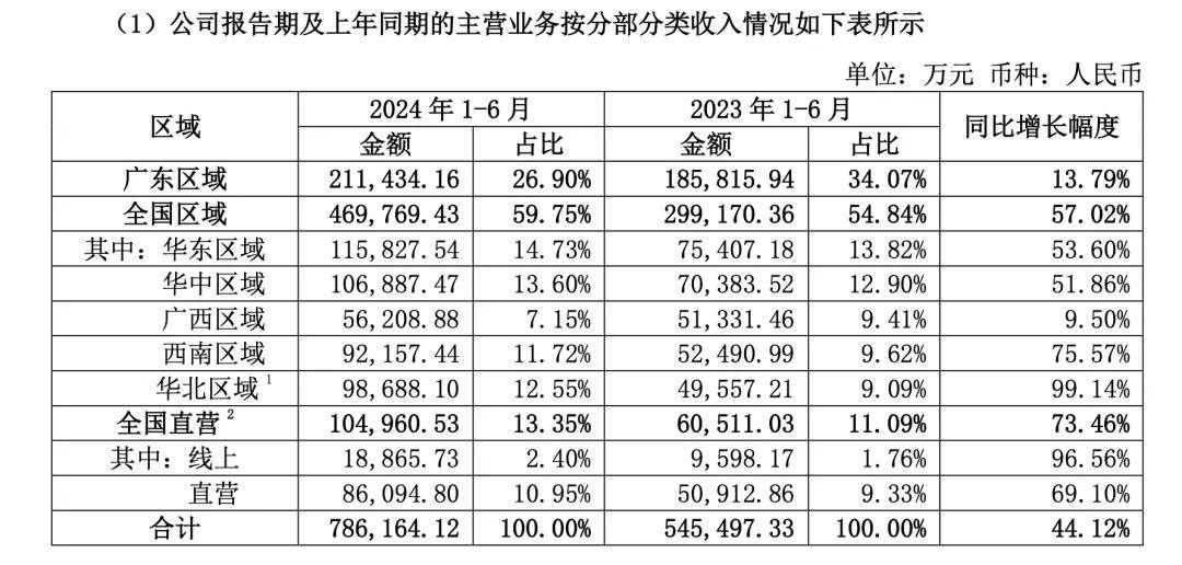 這個從廣東走出的地域性飲料品牌,如今也在走向北方。今年上半年,廣東區(qū)域占比從34.07%下降到26.9%。包括華北事業(yè)部、北方事業(yè)部的華北區(qū)域銷售收入從去年上半年的4.9億元增長到今年上半年的9.8億元,從占比9%增長到12%,是擴展最快的。