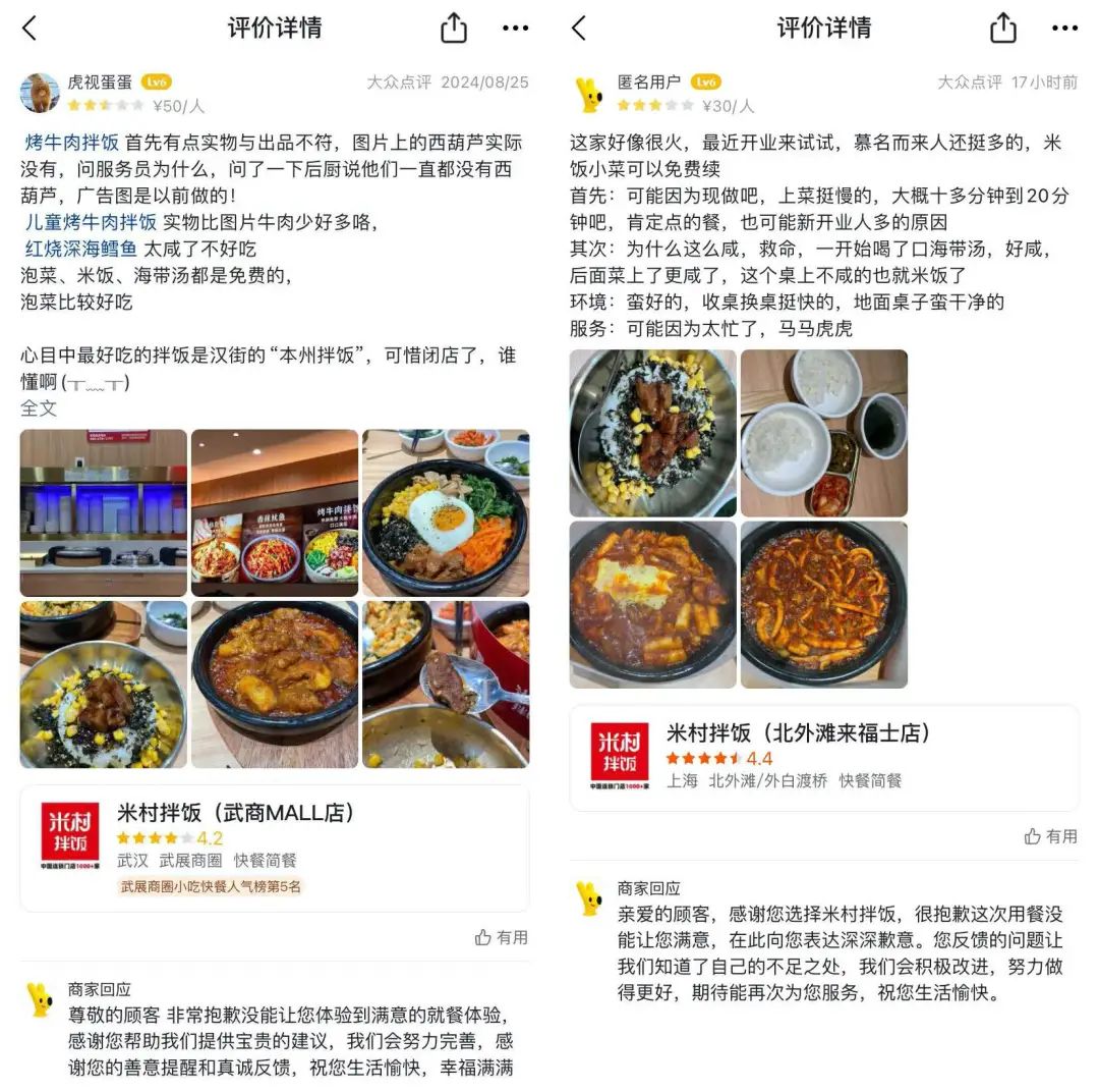 但查閱美團(tuán)可以發(fā)現(xiàn),米村拌飯?jiān)诤焙驼憬拈T店有不少質(zhì)疑的聲音。比如,一位顧客在米村拌飯武漢武商MALL店就餐后評(píng)價(jià)稱,“紅燒深海鱈魚太咸了不好吃”。無獨(dú)有偶,也有一位顧客在米村拌飯上海北外灘來福士店就餐后評(píng)價(jià)稱,“為什么這么咸,救命,一開始喝了口海帶湯,好咸,后面菜上了很咸,整個(gè)桌上不咸的也就米飯了”。
