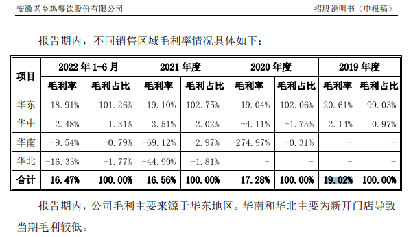 招股書顯示,2022年上半年,老鄉(xiāng)雞華東、華中、華南、華北地區(qū)的毛利率分別為18.91%、2.48%、-9.54%、-16.33%。因華南、華北地區(qū)門店深陷虧損泥潭,開啟全國擴(kuò)張后,老鄉(xiāng)雞的毛利率持續(xù)下行,2019年-2021年以及2022年上半年分別為19.02%、17.28%、16.56%以及16.47%。
