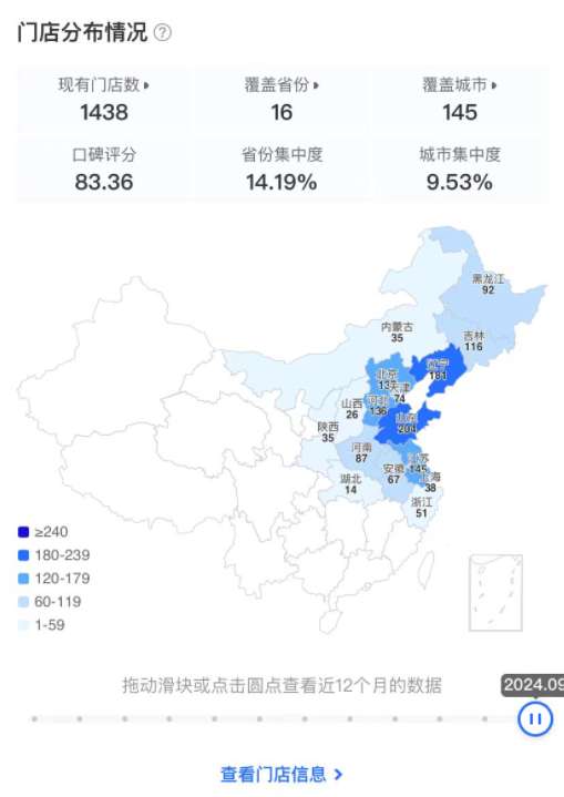 窄門餐眼顯示,米村拌飯的門店主要集中于東北和華北區(qū)域,2023年前后,開始試水南方市場(chǎng)。目前,米村拌飯?jiān)诤睋碛?4家門店,浙江擁有51家門店。