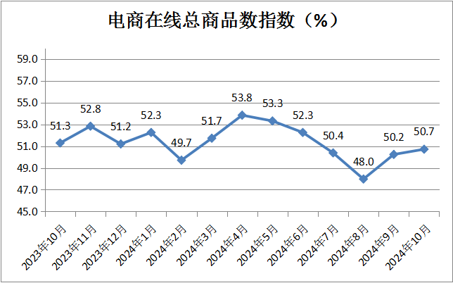 電商在線總商品數(shù)指數(shù)為50.7%,較上月微升0.5個百分點,表明電商經(jīng)營類企業(yè)備貨意愿溫和持續(xù)上升。
