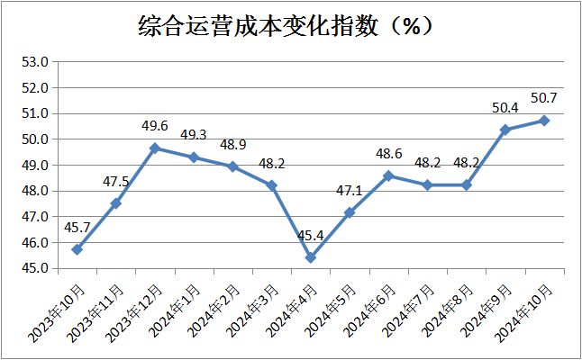 綜合運營成本反向指數(shù)為50.7%,較上月微升0.3個百分點,維持在擴張區(qū)間。分析認(rèn)為,平均單店租金收入和商鋪出租率雙升,以及秋冬換季商場中央空調(diào)等電力消耗顯著下降,是綜合運營成本相對降低的原因。租賃經(jīng)營類企業(yè)的成本預(yù)期壓力保持穩(wěn)定。
