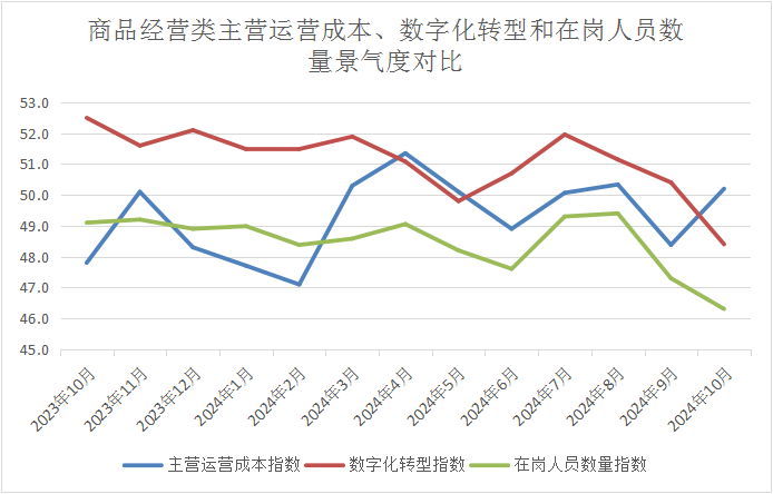 (二)數(shù)據(jù)顯示,10月份商品經(jīng)營類企業(yè)主營運營成本下降,與企業(yè)數(shù)字化轉(zhuǎn)型投入降低和在崗人員數(shù)量下降關(guān)聯(lián)度較大。這表明,目前階段降本增效依然是線下商品經(jīng)營類企業(yè)保持市場競爭力的重要手段。國內(nèi)消費潛能持續(xù)釋放需要政策不間斷發(fā)力,完善營商環(huán)境,鼓勵企業(yè)家精神,擴大就業(yè)渠道,穩(wěn)定良性市場預(yù)期。
