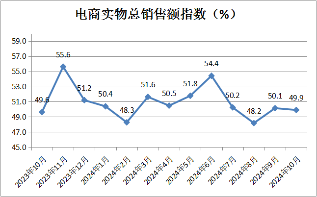 電商實物總銷售額指數(shù)為49.9%,較上月微降0.2個百分點。分析認(rèn)為,10月電商實物總銷售額指數(shù)維持在臨界點附近凸顯了電商渠道商品零售季節(jié)性的特點。