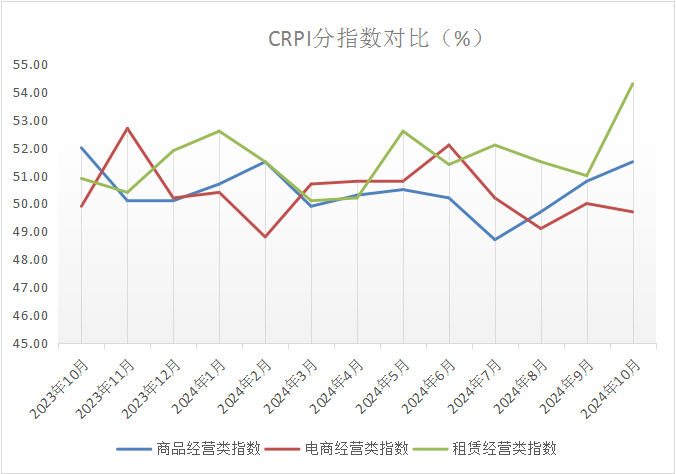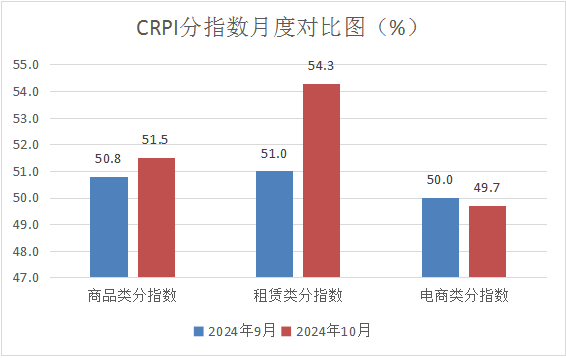 (一)CRPI三個分指數(shù)對比顯示,10月份商品經(jīng)營類指數(shù)景氣度持續(xù)升高,租賃經(jīng)營類指數(shù)景氣度迅速升高,電商經(jīng)營類指數(shù)景氣度季節(jié)性下降。這表明線下零售市場對9月底政策落地效果的期待較高。租賃運營類企業(yè)對此次政策變化的反應(yīng)更為直接,超出市場預(yù)期。