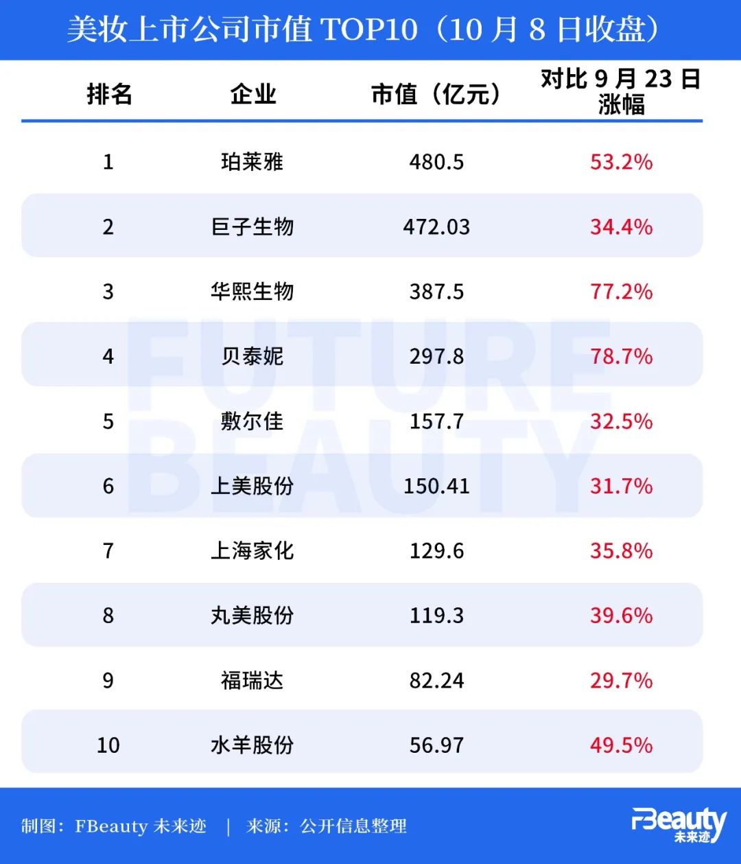 另外截至10月8日收盤,國內(nèi)美妝上市公司市值對比9月已經(jīng)迎來全新局面。其中珀萊雅以超480億元市值成為美妝第一股,另外華熙生物、貝泰妮以超過70%的增幅成為市值增長最高的兩家美妝公司,另外巨子生物、敷爾佳、上美股份、丸美股份、福瑞達(dá)和水羊股份的市值增幅也均超過或接近30%左右,綜合來看,勢頭一片向好。