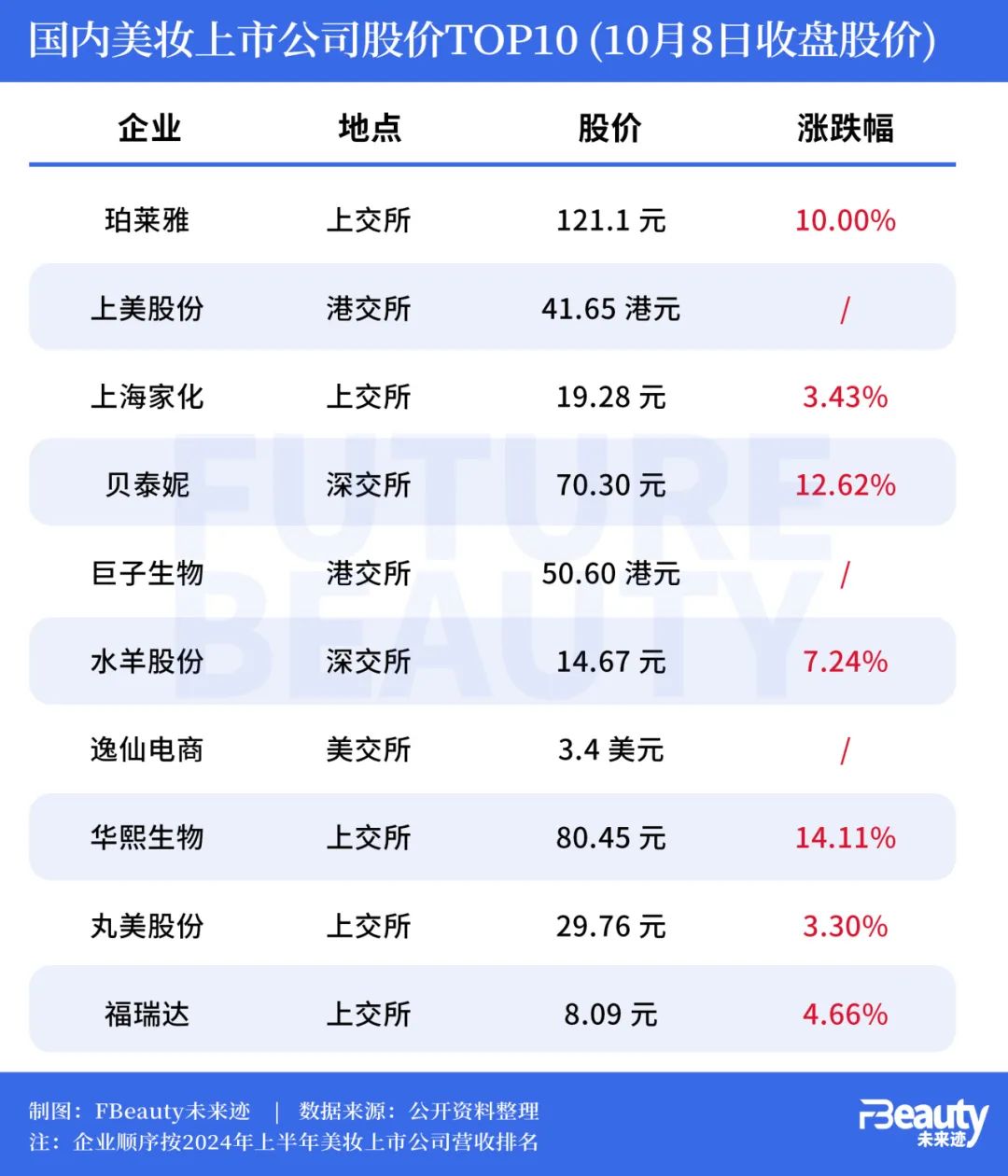《FBeauty未來跡》整理發(fā)現(xiàn),單就今年上半年國內(nèi)美妝TOP10上市公司的表現(xiàn)來看,于國內(nèi)上市的7家企業(yè)集體迎來了股價(jià)增長。