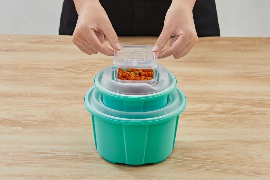 針對砂鍋菜,金億佳鑫則采用了上下分離的疊放設(shè)計,把兩個大小不同的餐盒疊放在一起。小的餐盒裝米飯,盒蓋內(nèi)還暗藏了內(nèi)陷蓋,可以再放咸菜等小料。大的餐盒裝熱菜。不僅節(jié)約了空間,還讓米飯實現(xiàn)了更好的保溫效果。