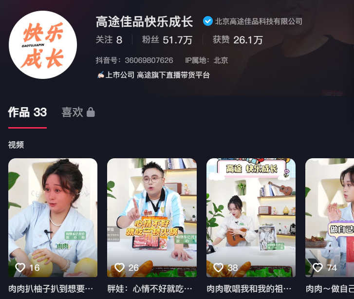 值得一提的是,主播肉肉在該賬號的直播中表示,公司的直播業(yè)務(wù)并未全面終止,而是“高途佳品”直播間暫停停播,未來該賬號將轉(zhuǎn)型為集團(tuán)品牌宣傳的平臺,而直播帶貨的功能則轉(zhuǎn)移至“高途佳品快樂成長”賬號。