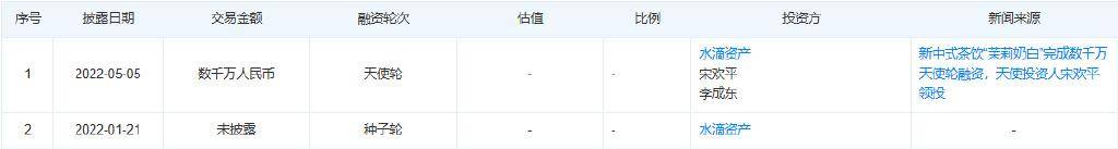 天眼查顯示,這是茉莉奶白獲得的第三輪融資。2022年1月,茉莉奶白獲得了來自水滴資產(chǎn)的種子輪融資,交易金額未披露。同年5月,茉莉奶白完成上千萬元天使輪融資,由天使投資人宋歡平領(lǐng)投,海豚社創(chuàng)始人李成東、歡樂虎基金跟投。值得一提的是,宋歡平之前曾投資過樂樂茶等新茶飲品牌以及虎頭局中式糕點(diǎn)、陳香貴蘭州牛肉面等餐飲品牌。