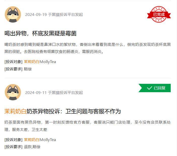 不僅是味道受到質(zhì)疑,茉莉奶白還曾發(fā)生過多起食品安全問題。黑貓投訴平臺(tái)上,有多條關(guān)于茉莉奶白的投訴。一位消費(fèi)者投訴稱,自己在密封完整的茉莉奶白中喝出了一只蒼蠅,而商家未經(jīng)消費(fèi)者同意卻私自退款。另一消費(fèi)者則因茉莉奶白杯底的不明絮狀物,在醫(yī)院檢查出了腸胃炎。此類事情并不是個(gè)例,社交平臺(tái)上,有網(wǎng)友吐槽在茉莉奶白中發(fā)現(xiàn)了蟲子、毛發(fā)、磁鐵等異物。
