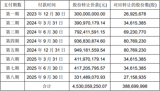 根據(jù)調(diào)整方案,第三期股份轉(zhuǎn)讓價款和后續(xù)幾期款項,共38.39億元,將繼續(xù)分8期執(zhí)行,付款周期較之前延長了半年,最后一次付款時間從2025年9月30日,延期至2026年3約31日