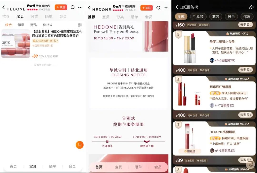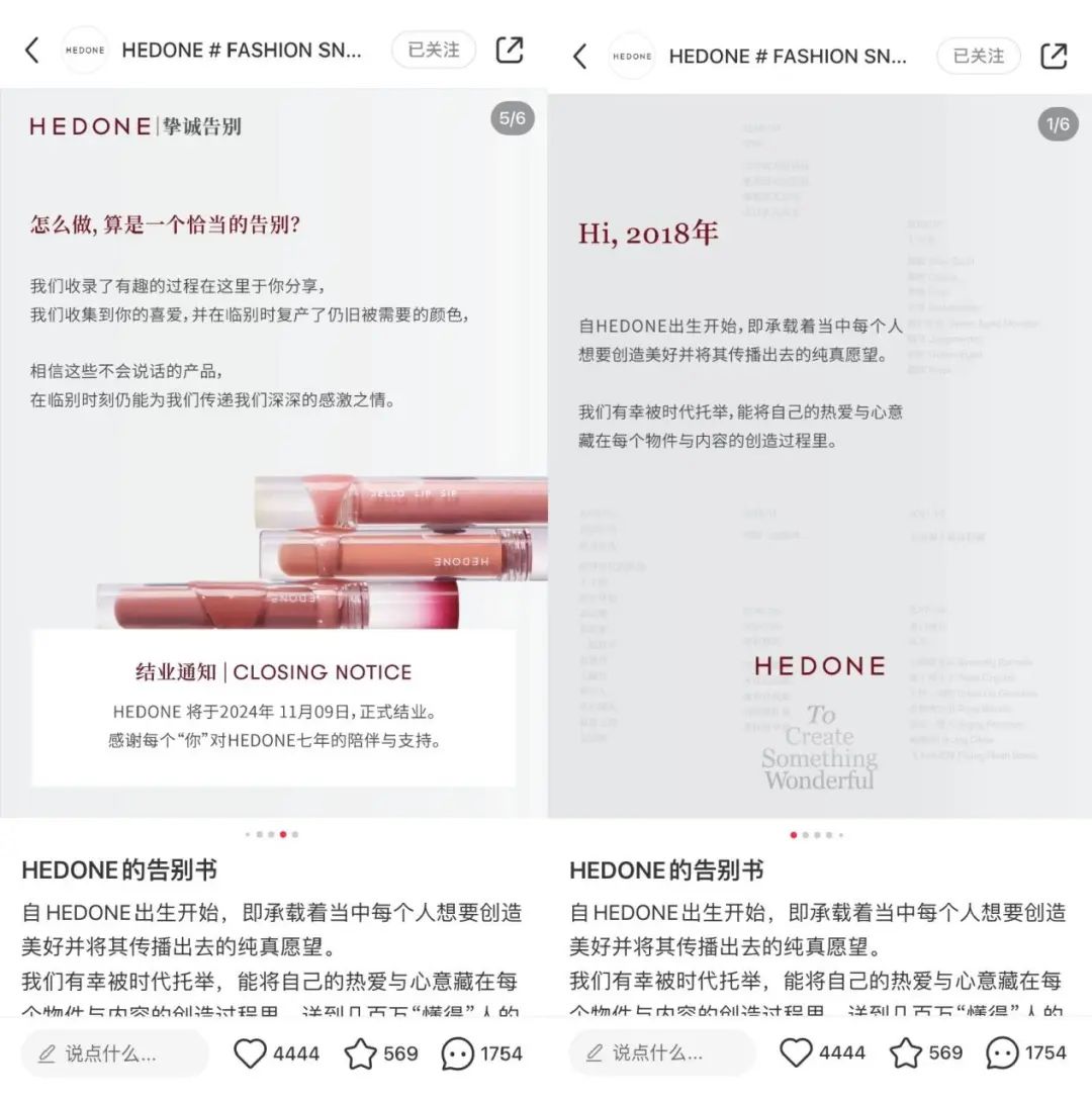 10月10日上午,新銳彩妝品牌HEDONE在其小紅書、微信公眾號(hào)官方賬號(hào)中,發(fā)布了一篇題為“HEDONE的告別書”的文章。與此同時(shí),據(jù)HEDONE品牌天貓官方旗艦店主頁(yè)顯示,HEDONE將于11月9日正式結(jié)業(yè),店鋪服務(wù)將終止于11月30日。