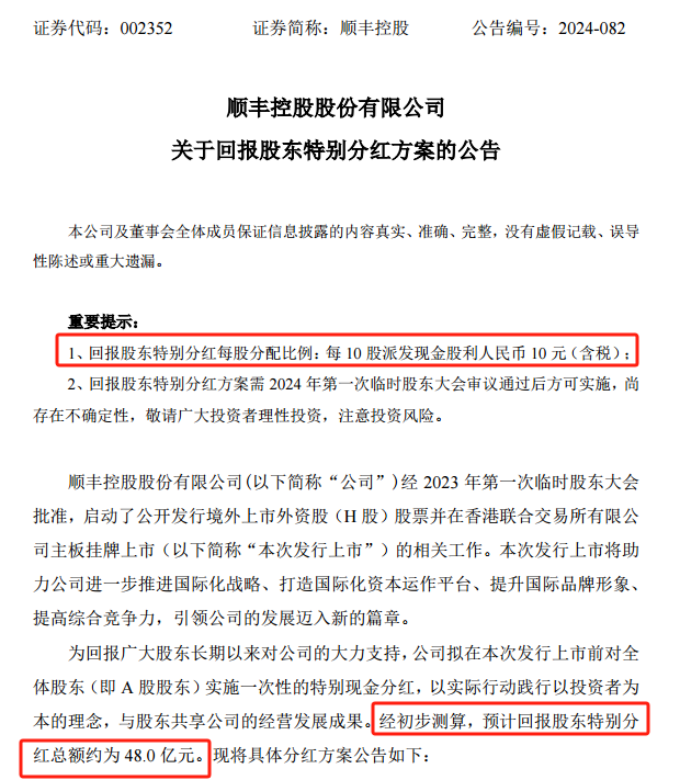 當然,除了中期分紅,順豐還擬在港股IPO之前,對A股股東實施一次性特別現(xiàn)金分紅,每10股派發(fā)現(xiàn)金股利10元(含稅),預計分紅總額約為48億元。