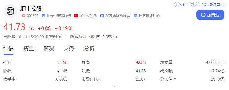 在分紅、回購的帶動下,市場反應積極,順豐股價因此得到提振。截至10月11日收盤,順豐控股報41.73元,當日漲幅0.19%,總市值為2010億元。