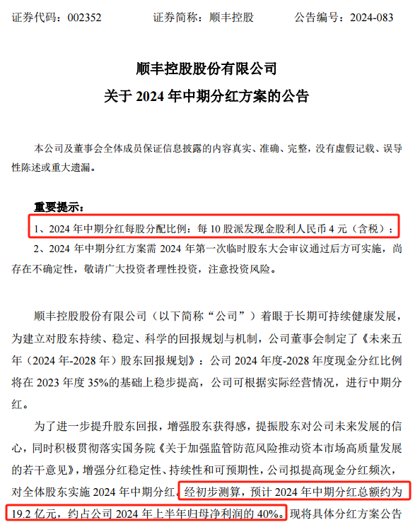 此次分紅,是順豐回報廣大股東長期以來的支持。其中,2024年中期分紅是順豐根據(jù)實際經(jīng)營情況進行,每10股派發(fā)現(xiàn)金股利4元(含稅)。經(jīng)初步測算,預計2024年中期分紅總額約為19.2億元,約占2024年上半年歸母凈利潤的40%。