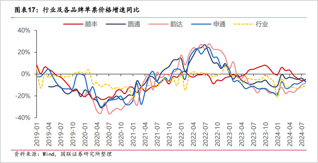而韻達2022年的單票價格在通達系中還是最高的,達2.6元,高于圓通的2.59元、申通的2.53元以及中通的1.34元。2024年8月單票價格相對于2022年已經(jīng)下降了23.46%。