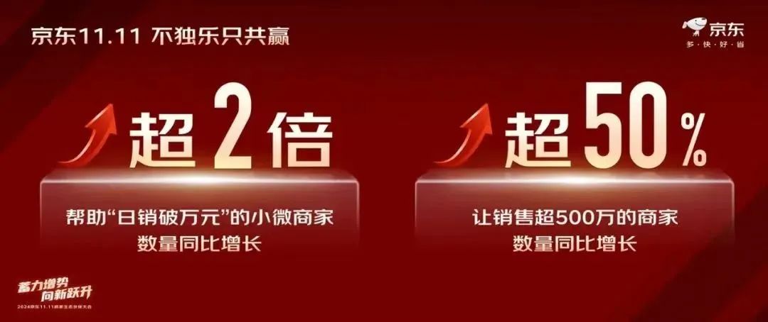 京東提出,將為商家實(shí)現(xiàn)“流量更多、運(yùn)營更快、服務(wù)更好、成本更省”的生態(tài)服務(wù),計劃在雙11期間推動“日銷破萬”的小微商家數(shù)量增長超2倍,推動銷售破500萬商家數(shù)量同比增長超50%。