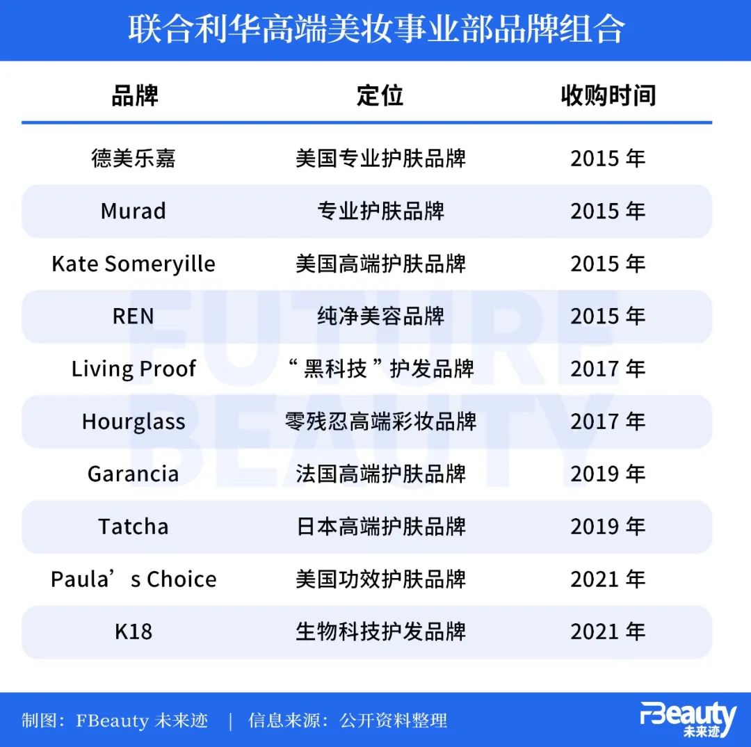 通過(guò)持續(xù)且密集的并購(gòu),聯(lián)合利華打造出一個(gè)10大品牌組成的高端美妝矩陣,覆蓋護(hù)膚、彩妝、護(hù)發(fā)三大賽道,并有意聚集了“零殘忍”“純凈美容”“日式高奢”“黑科技”符合未來(lái)美妝趨勢(shì)潮流的品牌標(biāo)簽。