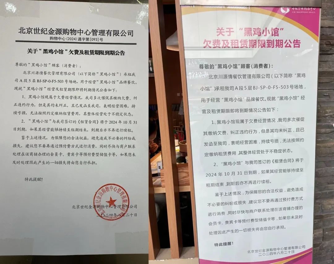 起因是8月份,北京世紀(jì)金源商場(chǎng)在黑雞小館門(mén)口發(fā)布了一則《欠費(fèi)及租賃到期公告》。