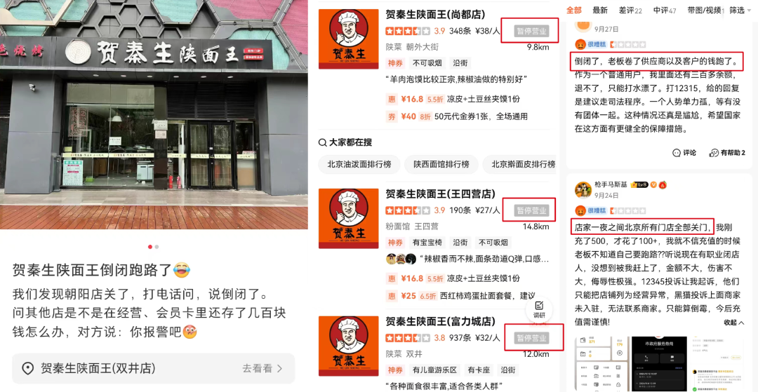 比如,被不少打工人稱為“全北京最正宗陜西面”的“賀秦生陜面王”,朝陽店被網(wǎng)友曝出“倒閉跑路”了。內(nèi)參君在大眾點(diǎn)評(píng)搜索到,這家連鎖面館,國貿(mào)店、尚都店、王四營店、富力城店全部顯示“暫停營業(yè)”。并有大量網(wǎng)友痛斥“我們也是單位在這里充值,還剩2800多,打水漂了”,“老板卷了供應(yīng)商及客戶的錢跑了”,也有人好奇“之前生意挺好。】赡苁莾r(jià)格太低,盈利模式難以支撐運(yùn)營”。