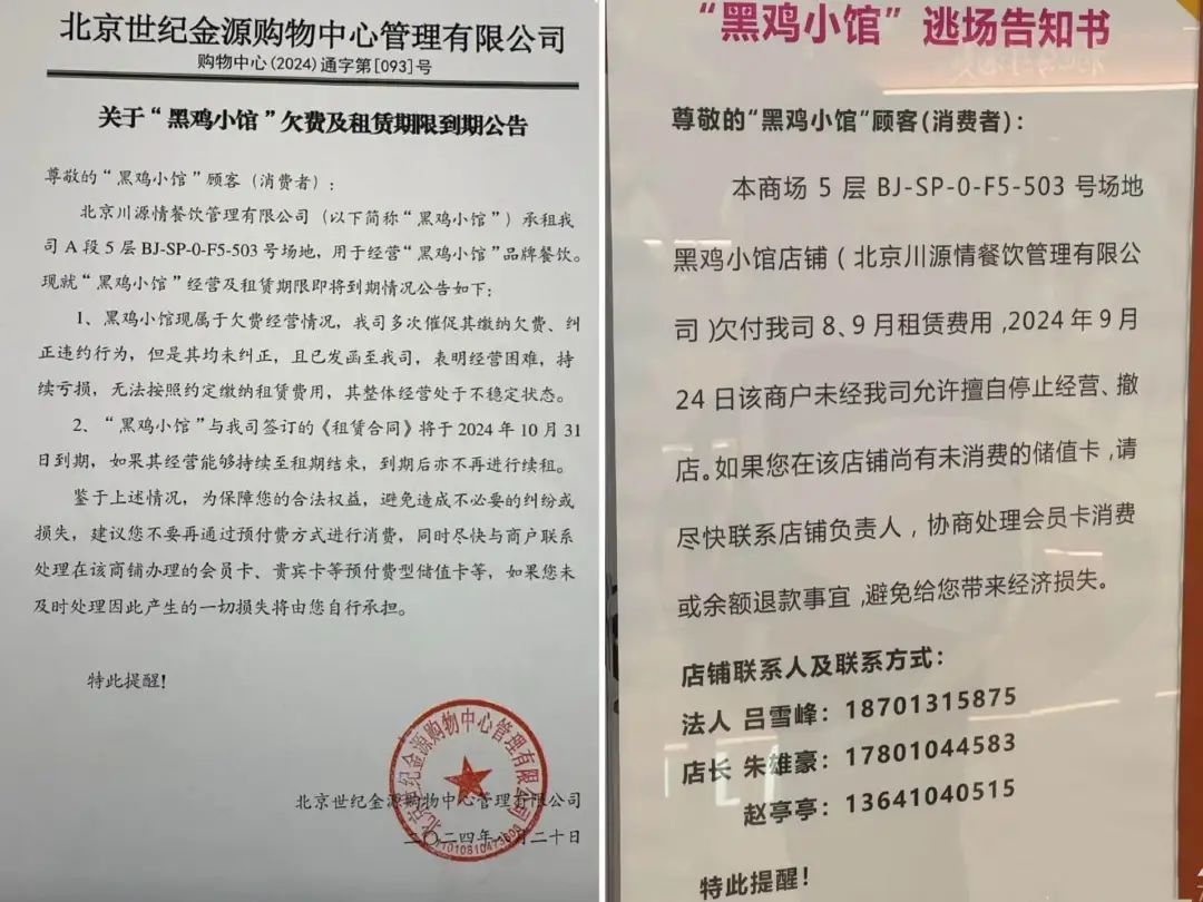 這是北京世紀(jì)金源購物中心,對(duì)餐飲品牌“黑雞小館”發(fā)布的告知書。