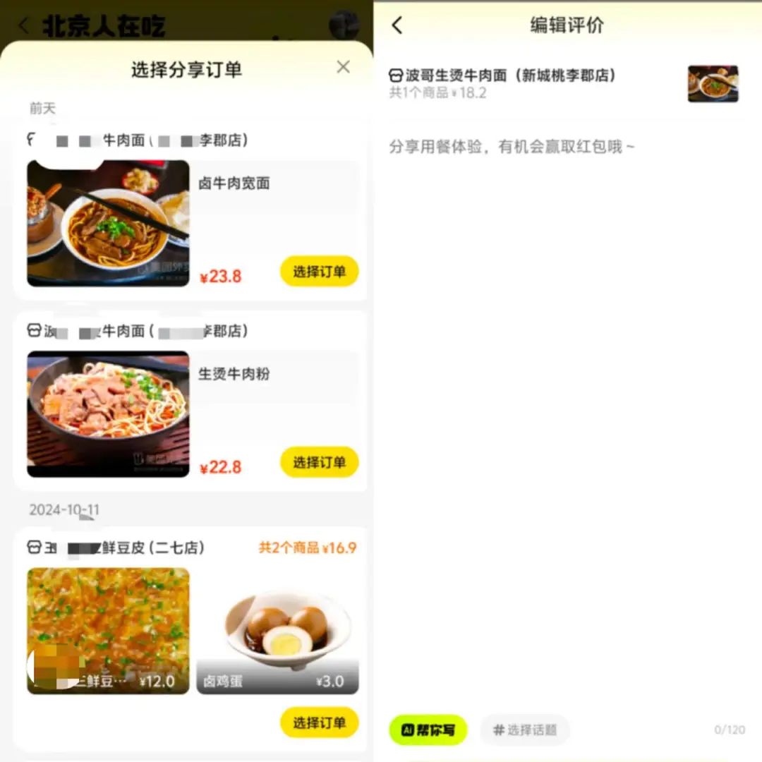 如果沒有很好的創(chuàng)作思路,也可以選擇“AI幫你寫”的功能。輸入簡短的文案后,AI會結(jié)合訂單內(nèi)容,生成一段用餐感受。