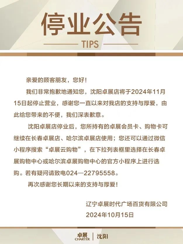 10月15日,卓展購物中心沈陽店發(fā)布公告稱,門店將于11月15日停止?fàn)I業(yè),停業(yè)后,卓展會員卡、購物卡可在長春卓展店、哈爾濱卓展店使用。