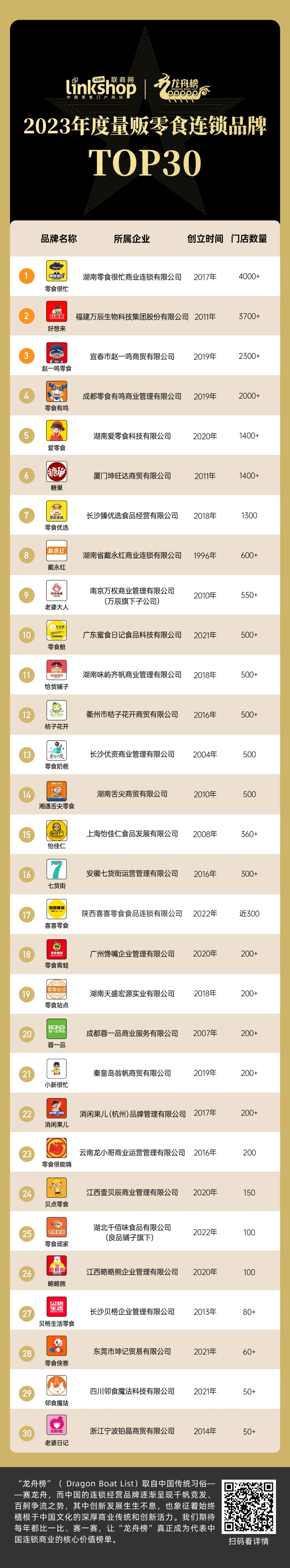 根據(jù)聯(lián)商網(wǎng)發(fā)布的《2023年度量販零食連鎖品牌TOP30》,零食有鳴位列第四,排位僅次于零食很忙、好想來(lái)、趙一鳴零食。