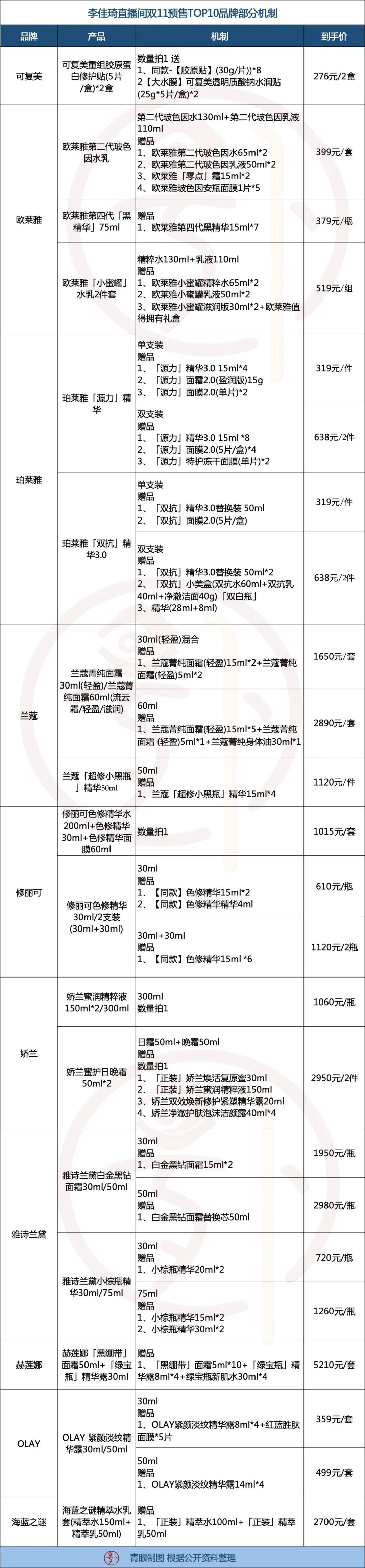 低價(jià)仍是主旋律,“買正送正”已經(jīng)成常態(tài)。青眼號(hào)外注意到,為迎合大促需求,在李佳琦直播間包括海藍(lán)之謎、科顏氏、嬌蘭、WHOO、SK-II、雅詩蘭黛、倩碧、朵梵等國際大牌,以及自然堂、璦科縵等國貨品牌,均推出了“買正送正”的機(jī)制。青眼號(hào)外也統(tǒng)計(jì)了李佳琦直播間TOP10品牌的部分機(jī)制,發(fā)現(xiàn)品牌們均拿出了較高力度的折扣。