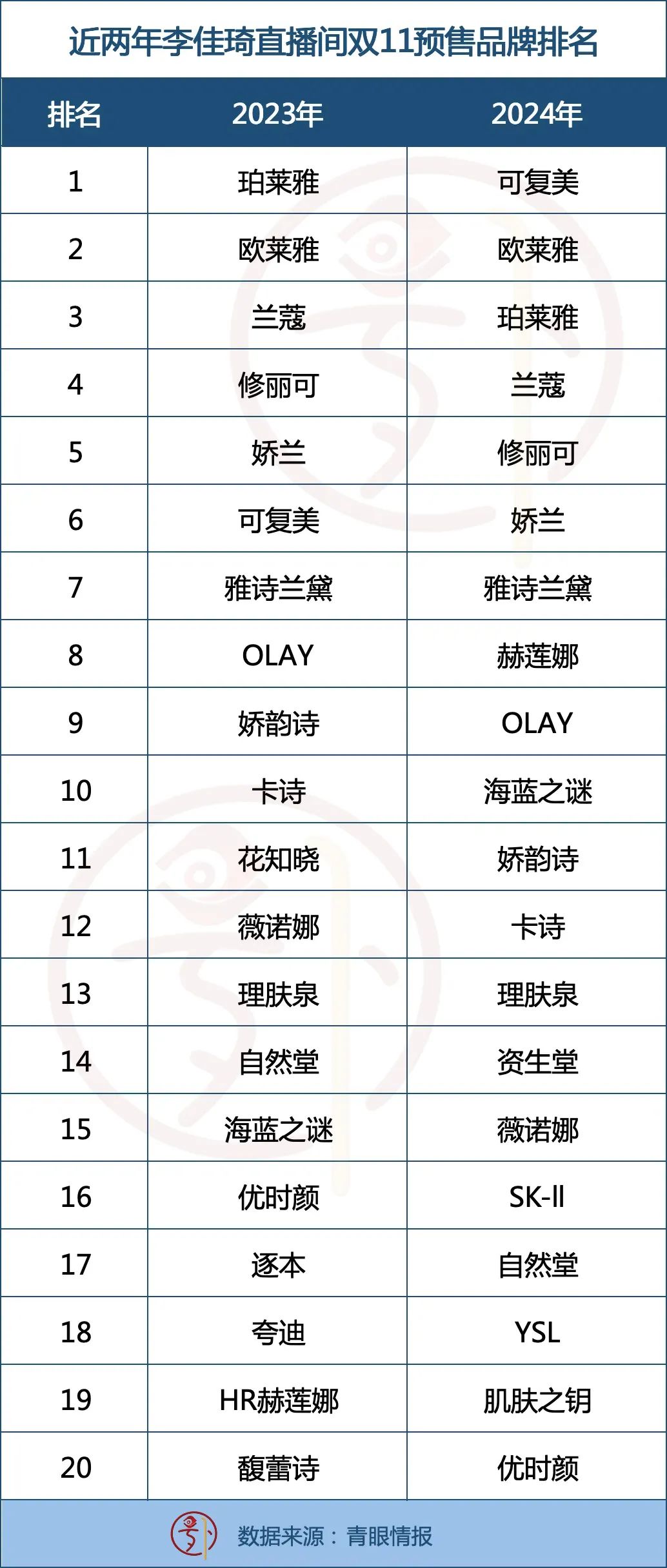 珀萊雅第一,巴黎歐萊雅第二。從天貓雙11預(yù)售首日成績單來看,珀萊雅繼續(xù)蟬聯(lián)第一,巴黎歐萊雅則位居第二,第三則被修麗可占據(jù),去年位列榜單第三的蘭蔻此次則下滑至第五名。