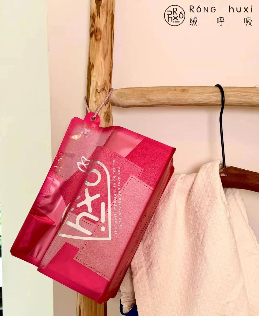 鎏金和燙銀,你很少能在一次性產(chǎn)品上看到這樣的配色。它的包裝上看不到功能性的描述,譬如“厚、柔、不掉毛”等產(chǎn)品賣點詞。相反,由于配有掛繩、密封條等,它的樣子有點像一個小拎包,或是家居擺件。絨呼吸希望它放在女生的梳妝臺上,和大牌美妝一起出現(xiàn)的時候,是匹配的。