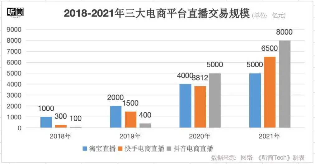隨后的幾年里,淘寶直播開(kāi)啟狂奔模式,尤其從2018年開(kāi)始,李佳琦和薇婭的爆紅,更是成為國(guó)民級(jí)主播,這也直接帶動(dòng)了淘寶直播的GMV,在過(guò)去幾年一直遙遙領(lǐng)先。