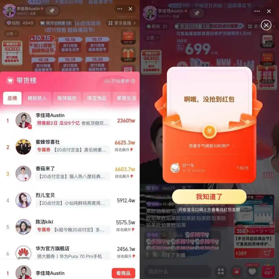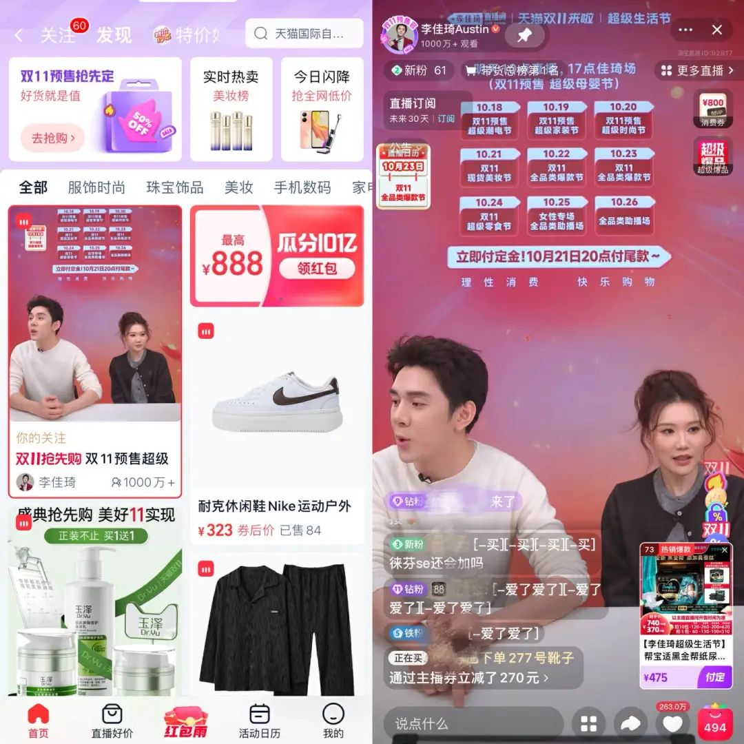 10月14日,天貓雙11開(kāi)啟預(yù)售,李佳琦直播間率先破億。
