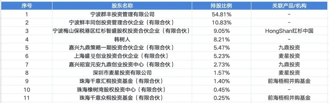 外部投資方中,紅杉資本通過寧波梅山保稅港區(qū)紅杉智盛股權投資合伙企業(yè)持有9.0%的股份,九鼎投資通過嘉興九鼎策略一期投資合伙企業(yè)和嘉興昭宣元安九鼎創(chuàng)業(yè)投資中心(有限合伙)共計持股8.2%;麥星投資則通過上海盛旻創(chuàng)業(yè)投資合伙企業(yè)與深圳市麥星投資有限公司分別持有5.23%和1.57%的股份。
