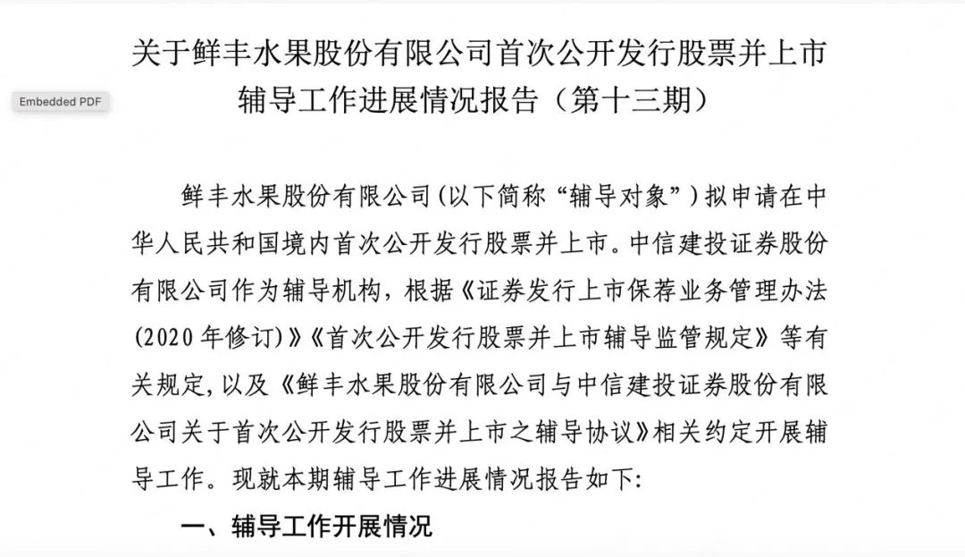一個月后,2021年2月,鮮豐水果便與中信建投證券簽訂了新的上市輔導協(xié)議。同年5月和7月,中信建投證券相繼公布了兩份鮮豐水果上市輔導工作報告。企查查顯示,今年4月,中信建投證券發(fā)布了第十三期輔導報告。